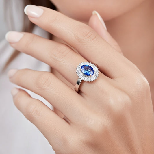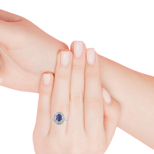 Елегантен годежен пръстен с танзанит и диаманти в бяло злато 18K – модел IT39