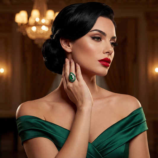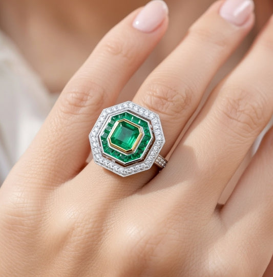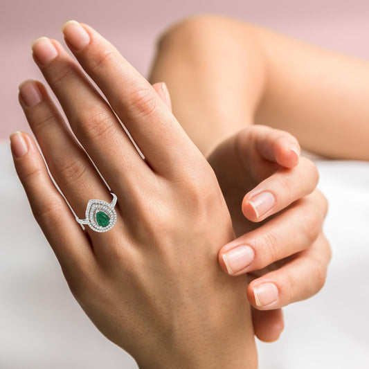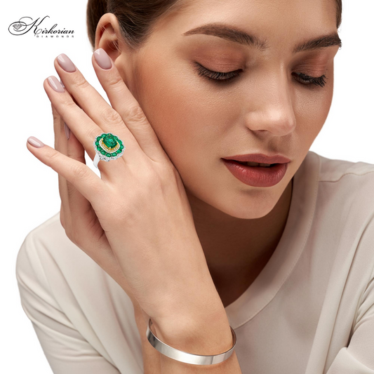 Пръстен със смарагд и диаманти в бяло злато 18К – изящество и лукс на достъпна цена