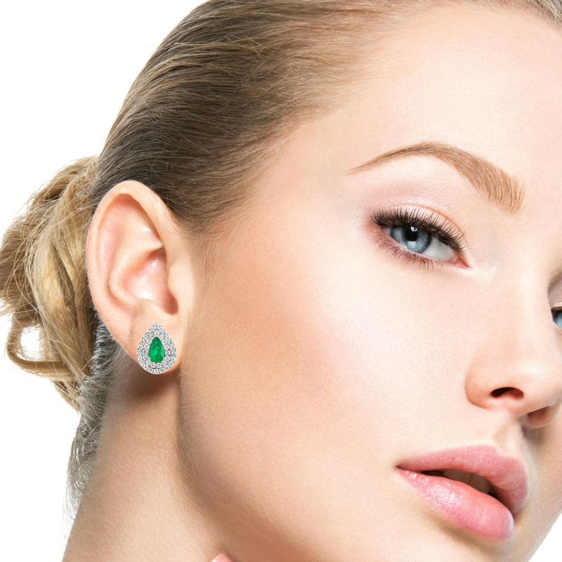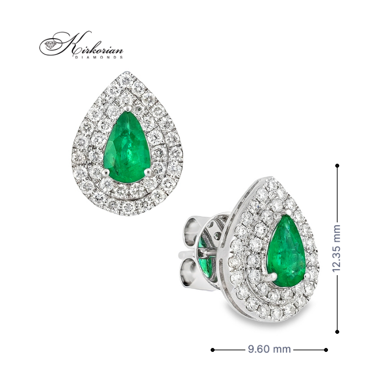 Елегантни обеци от бяло злато 18К с капковиден смарагд 0.70 ct, обграден от два реда естествени диаманти с общо тегло 0.48 ct. Моделът подчертава уникалния цвят на смарагда с ярък брилянтен блясък и предлага стил, който се откроява. Подходящ избор за клиенти, търсещи луксозно бижу с отлично съотношение цена и качество. Всички изделия се предлагат в луксозна подаръчна кутия със сертификат
