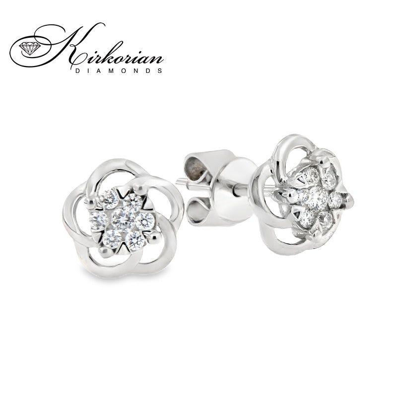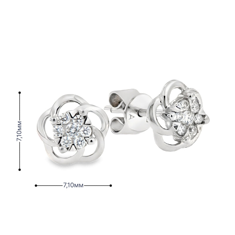 Елегантни флорални обеци от бяло злато 14К с диаманти 0.10 ct, подредени в нежна цветна композиция, създаваща ефект на по-голям централен камък. Модел OB003 предлага стилен и лек дизайн, подходящ за ежедневие и подарък, като осигурява балансиран диамантен блясък чрез прецизна брилянтна шлифовка. Изработени от злато проба 585 и предоставени с луксозна кутия и сертификат