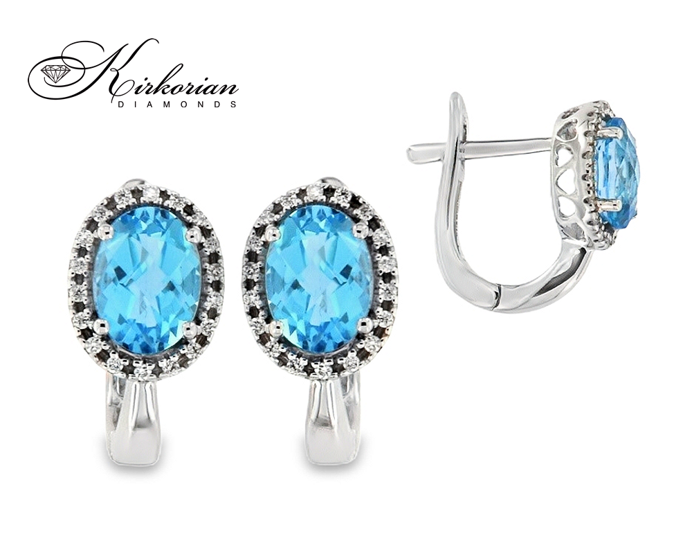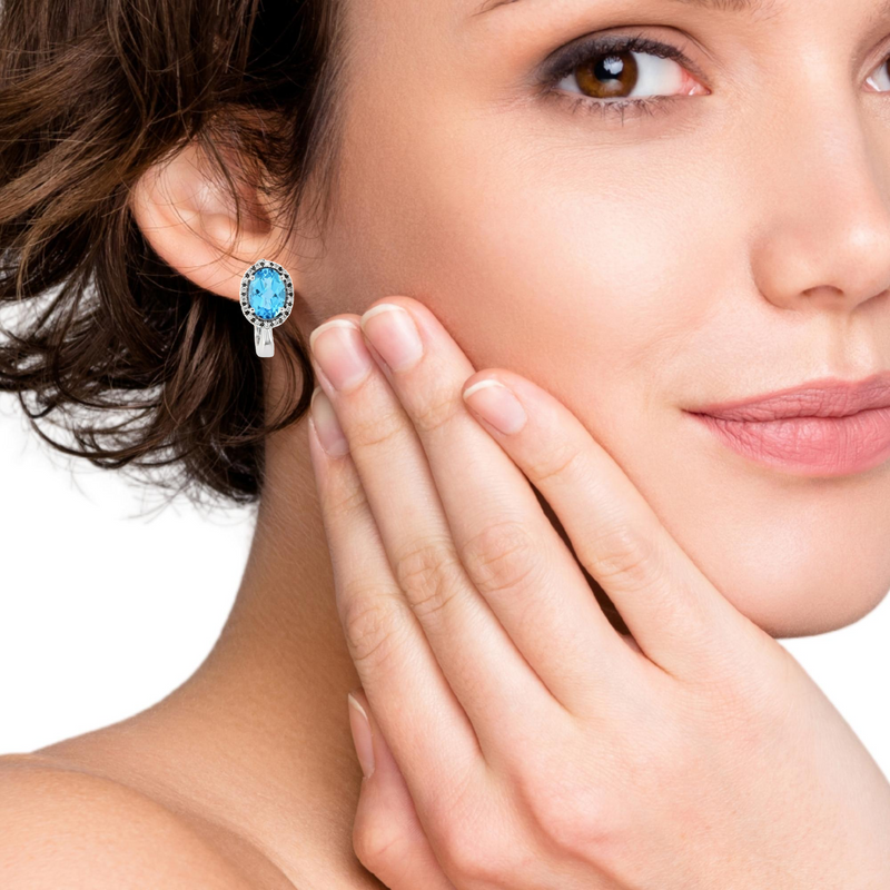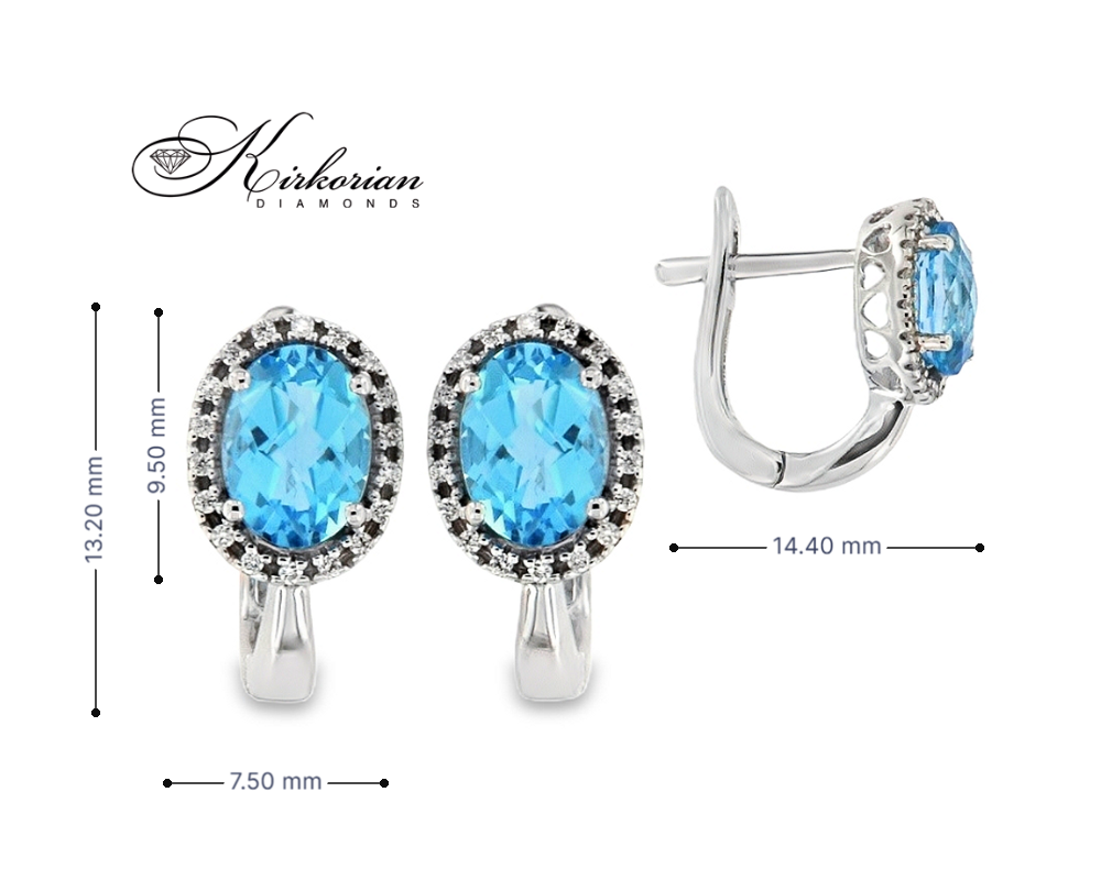 Стилни обеци от бяло злато 14К с топази 1.76 ct и диаманти 0.11 ct в изискан хало дизайн с английско закопчаване за сигурност и комфорт. Модел ON10 подчертава чистия син цвят на топаза и деликатния блясък на диамантите, създавайки балансиран и модерен вид. Изработени от злато проба 585 с естествени камъни и висококачествена шлифовка. Предлагат се в луксозна кутия и със сертификат
