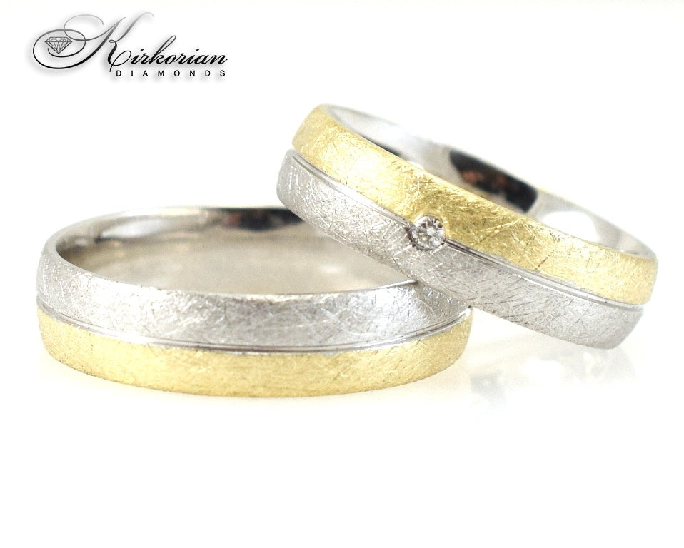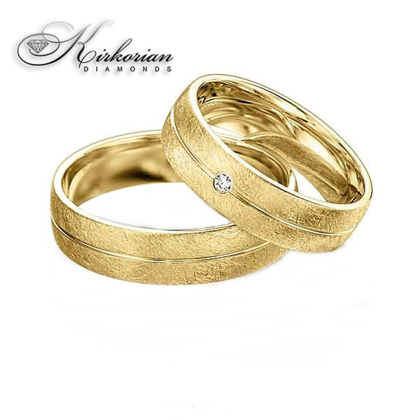 Брачни халки с матова повърхност, изработени от бяло и жълто злато 14 карата, с характерен текстуриран ефект, който придава стилна и ръчно изработена визия. Женската халка е инкрустирана с естествен диамант 0.02ct, който придава фин блясък и индивидуалност.