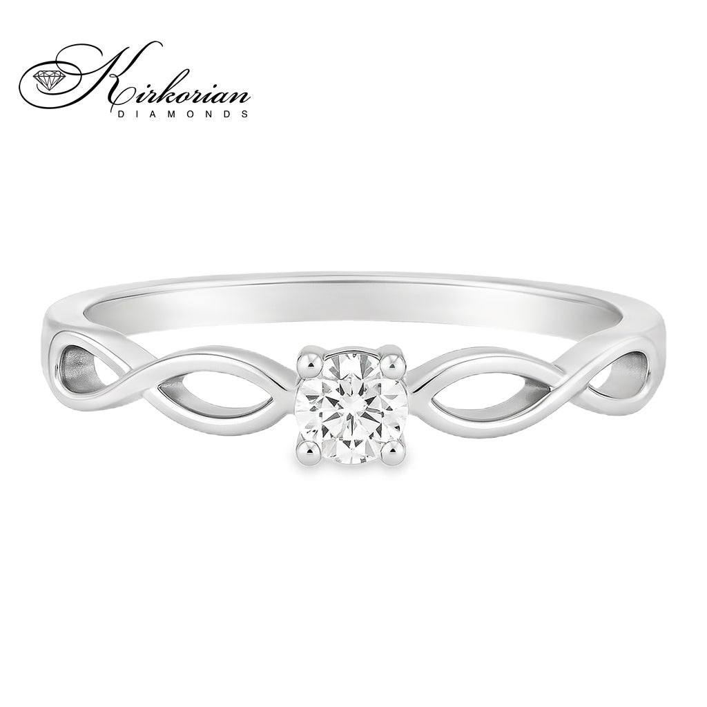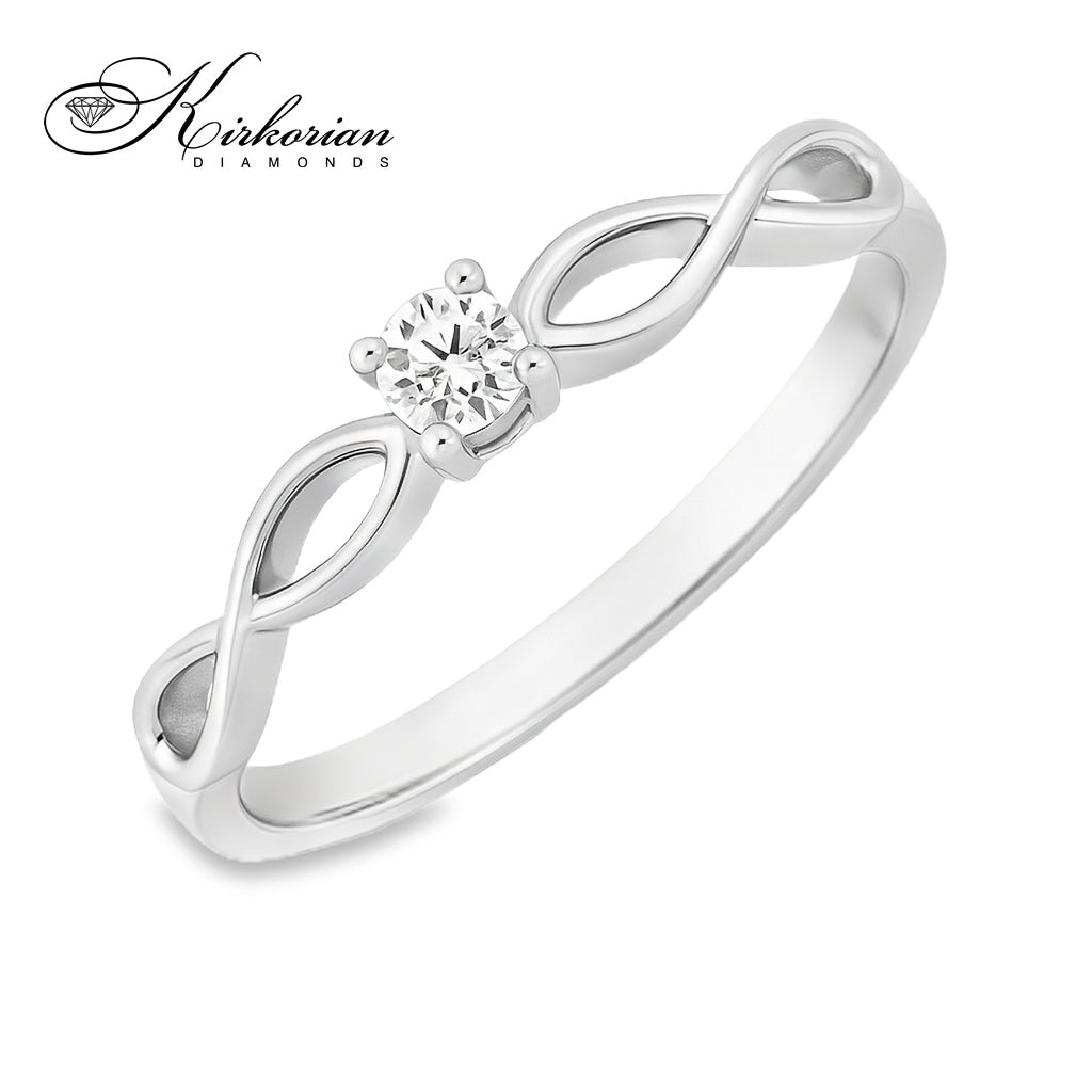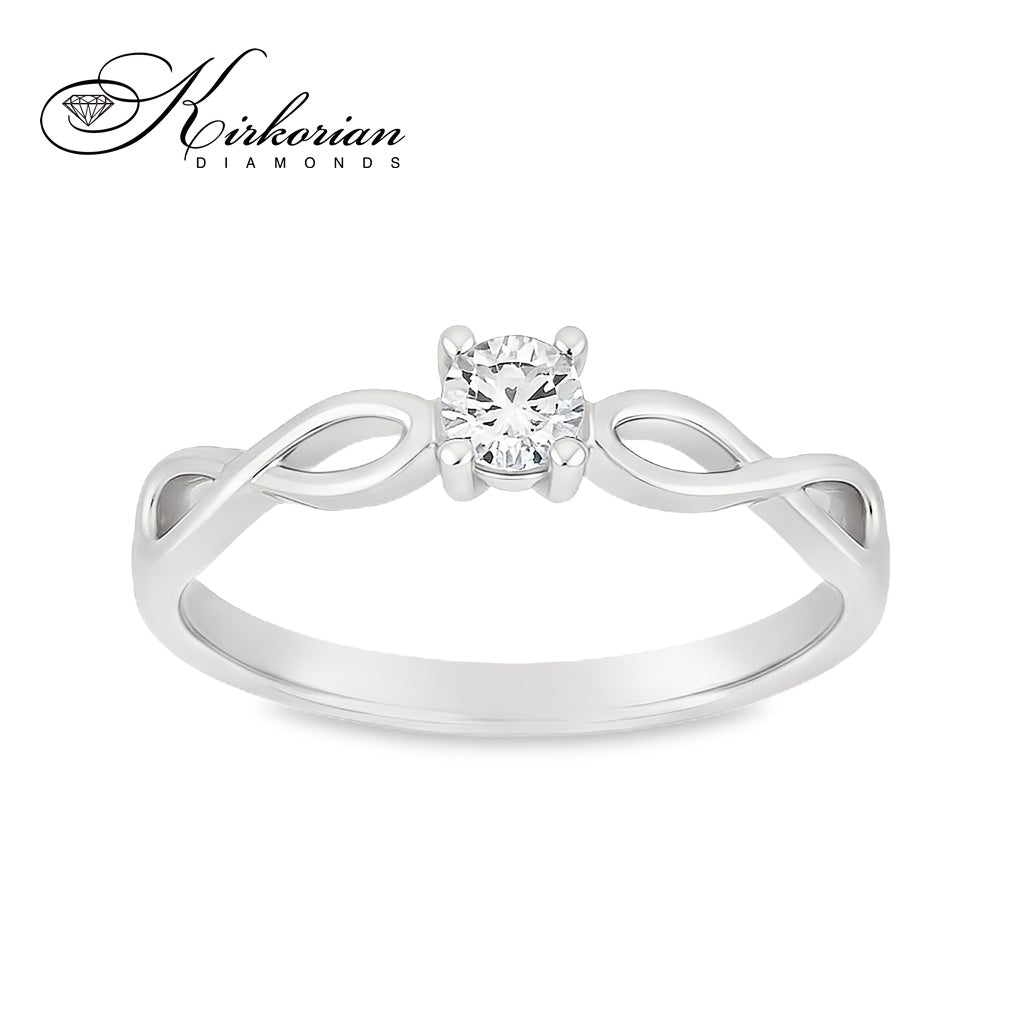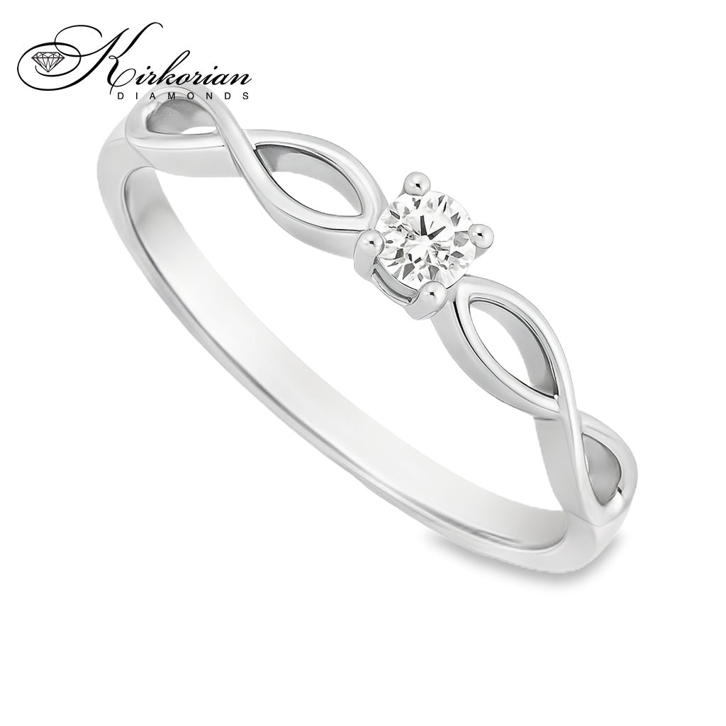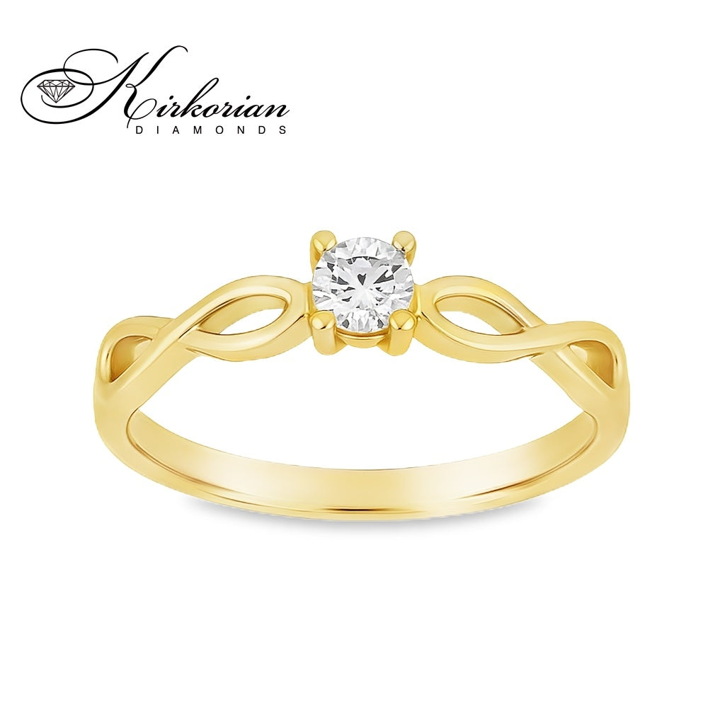 Изтънчен годежен пръстен от бяло или жълто злато 14К, инкрустиран с естествен диамант 0.10 ct, цвят E-F и чистота VS1. Дизайнът с елегантни извивки придава усещане за безкрайност – символ на вечна любов и стил. Брилянтната шлифовка подчертава сиянието на камъка и придава изключителна класа на бижуто.