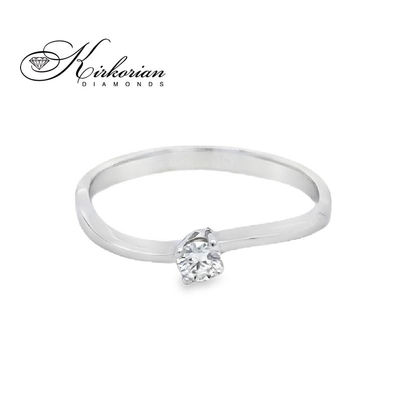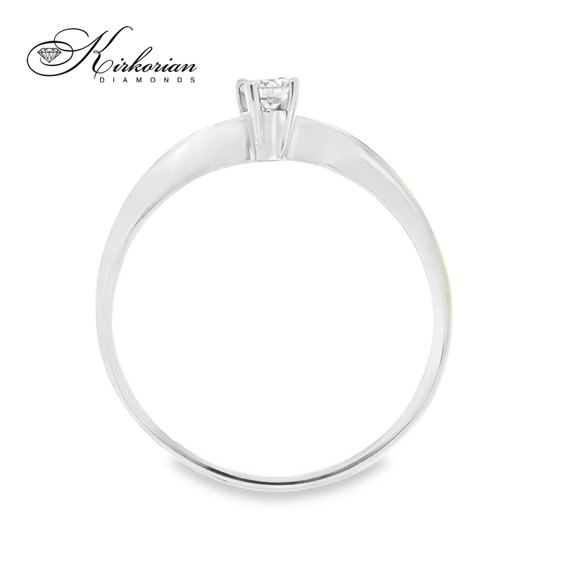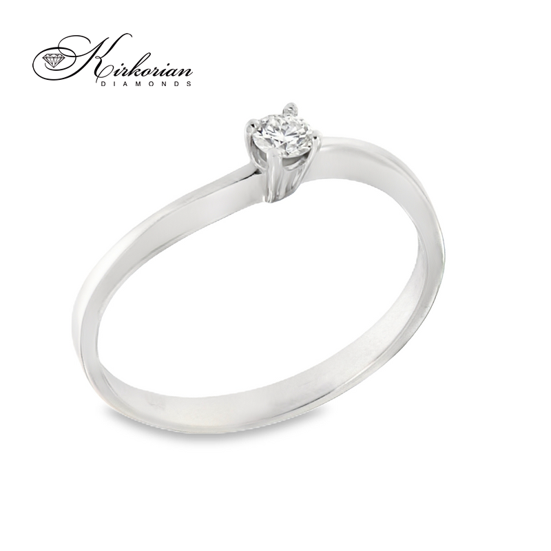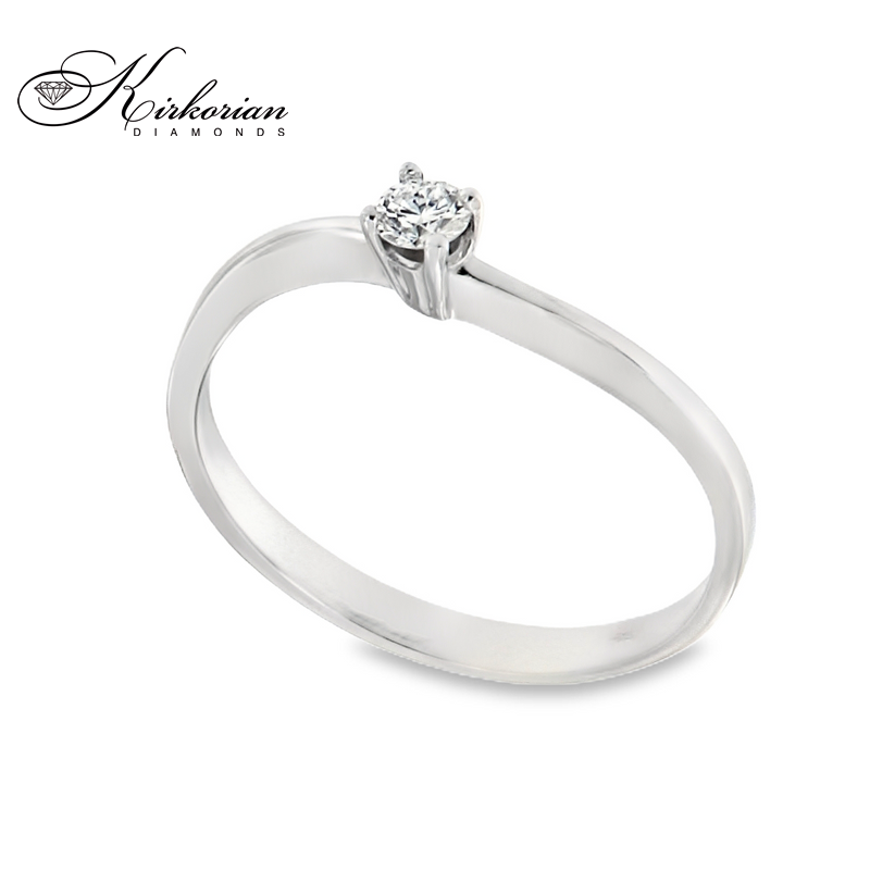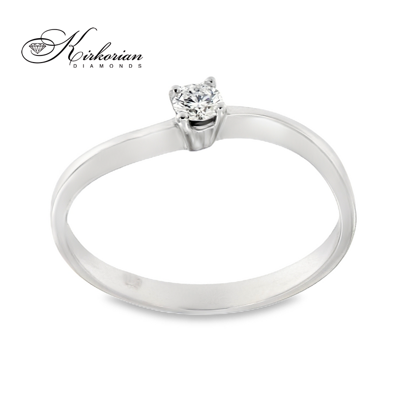 Изискан годежен пръстен от бяло злато 14 карата с централен естествен диамант 0.10 ct. Семплата линия и класическата 4-кука захватна корона го превръщат в елегантен избор за дама с фин вкус. Диамантът е с отличен блясък и пропорции – кръгла форма, цвят G–H, чистота SI и шлифовка Брилянт. Пръстенът е подходящ както за официални поводи, така и за ежедневно носене. Включена е луксозна подаръчна кутия