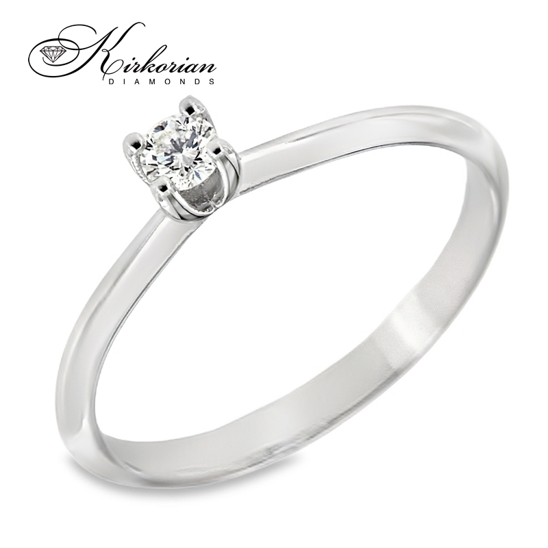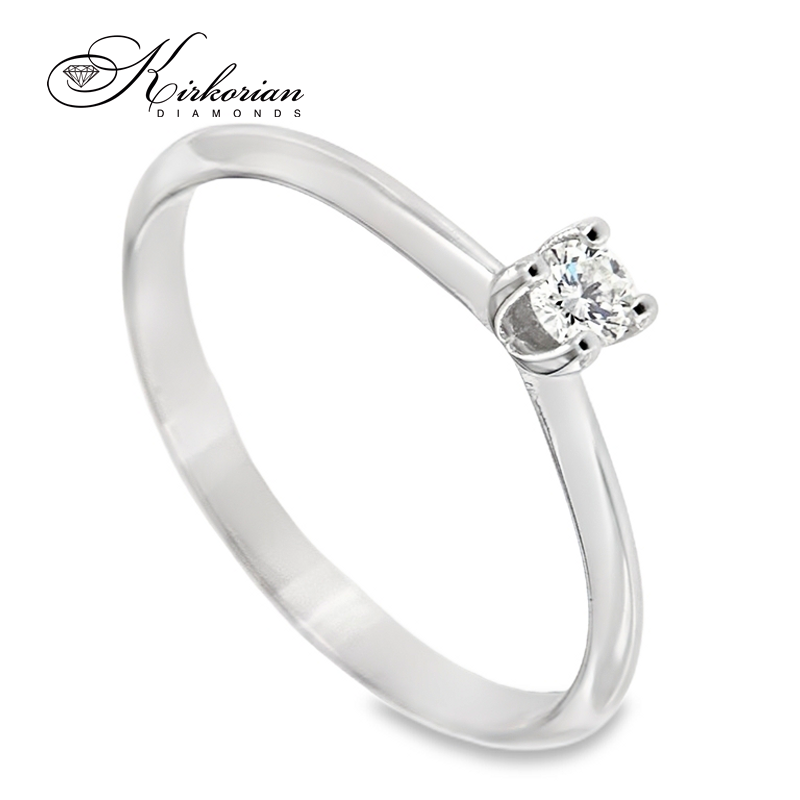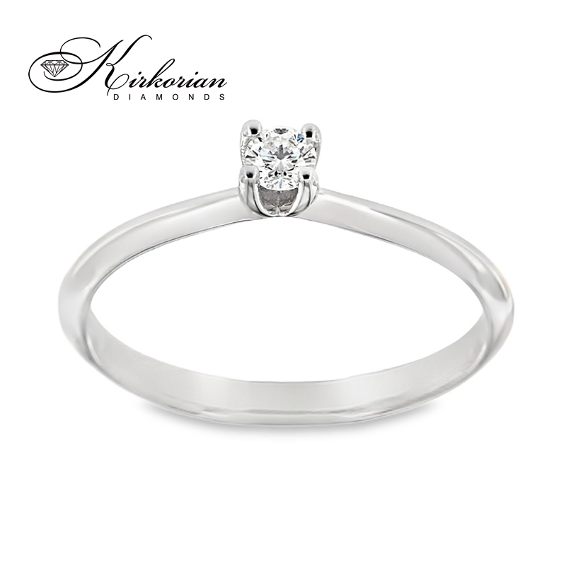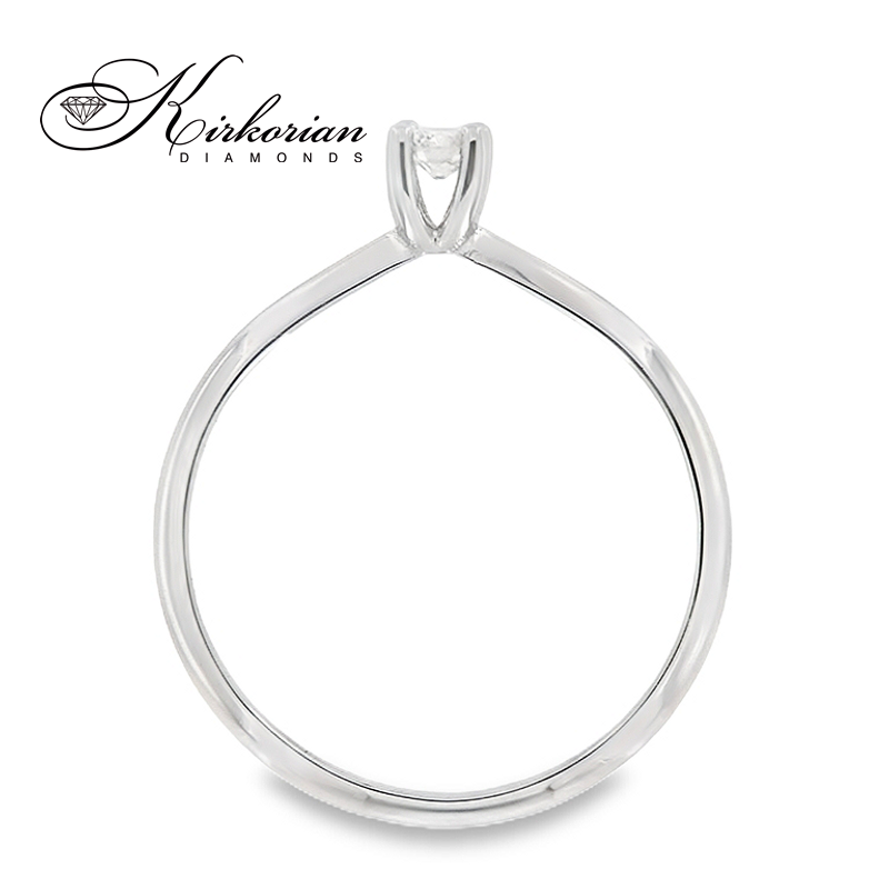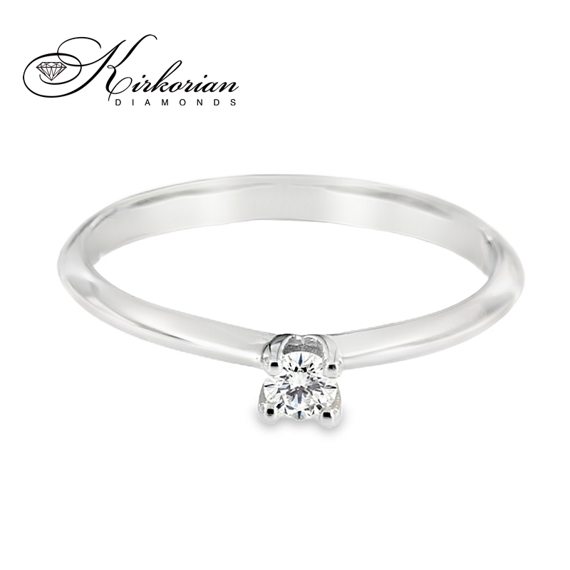 Класически годежен пръстен от бяло злато 14 карата, инкрустиран с естествен диамант 0.13 ct в елегантна четирикрака корона. Изчистеният дизайн подчертава блясъка на диаманта и създава усещане за лекота и изящество. Прецизната шлифовка Брилянт, комбинирана с цвят G–H и чистота SI, гарантира великолепен блясък. Идеален избор за изискано предложение за брак. Предлага се с включена луксозна подаръчна кутия