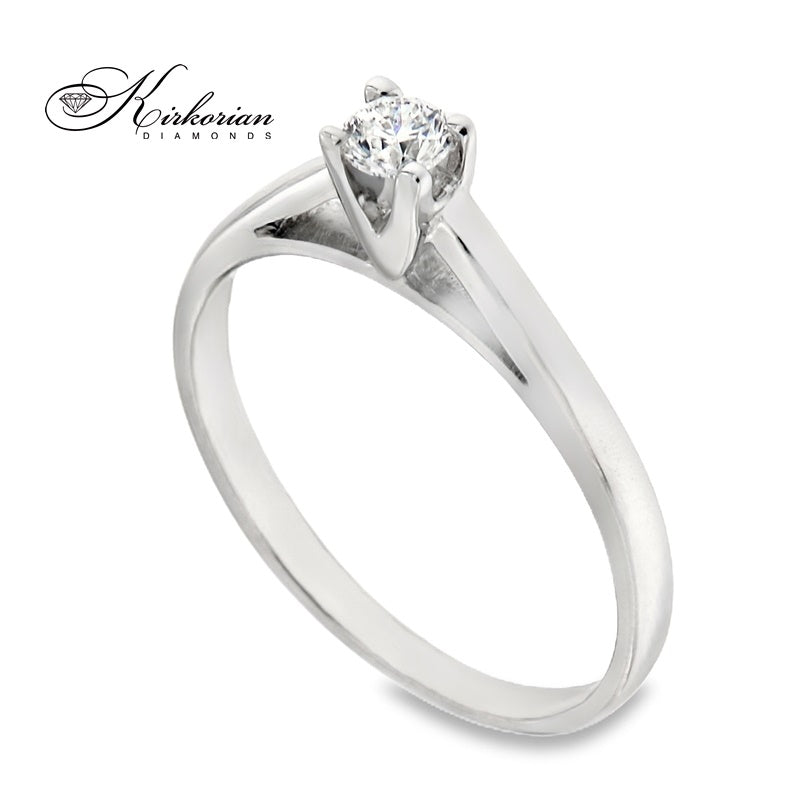 Елегантен годежен пръстен от бяло злато 14 карата с естествен диамант 0.15 карата и брилянтна шлифовка. Изчистен дизайн със стабилна четирикукична корона, която акцентира върху блясъка и формата на диаманта. Перфектен избор за класическо предложение с подчертана елегантност. Луксозна кутия и сертификат са включени в цената.