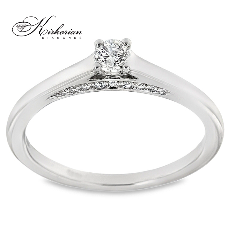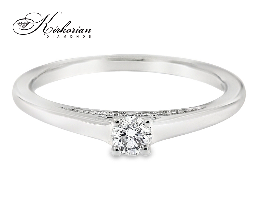 Елегантен годежен пръстен изработен от бяло злато 14 карата с прецизно инкрустирани естествени диаманти с общо тегло 0.25 ct. Централният камък е с брилянтна шлифовка и кръгла форма, подчертана от малки странични диаманти. Цвят G-H и яснота SI осигуряват забележителен блясък и изискан вид. Пръстенът е с KD сертификат и е с размер 53, като размерът може да се коригира според желанието на клиента. Идеално предложение за романтичен подарък, което се предлага с луксозна кутия и сертификат за автентичност