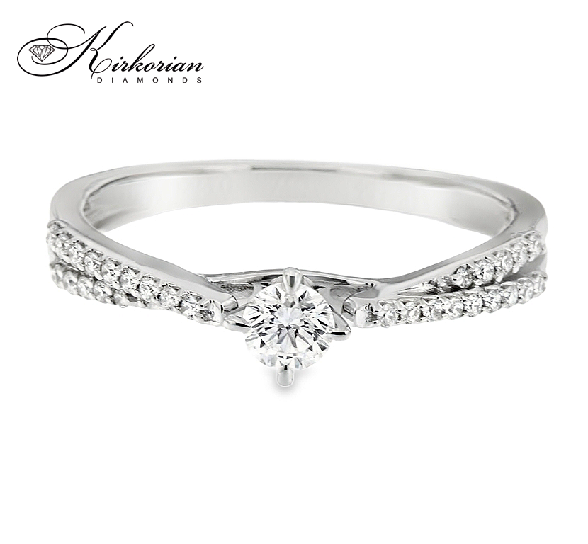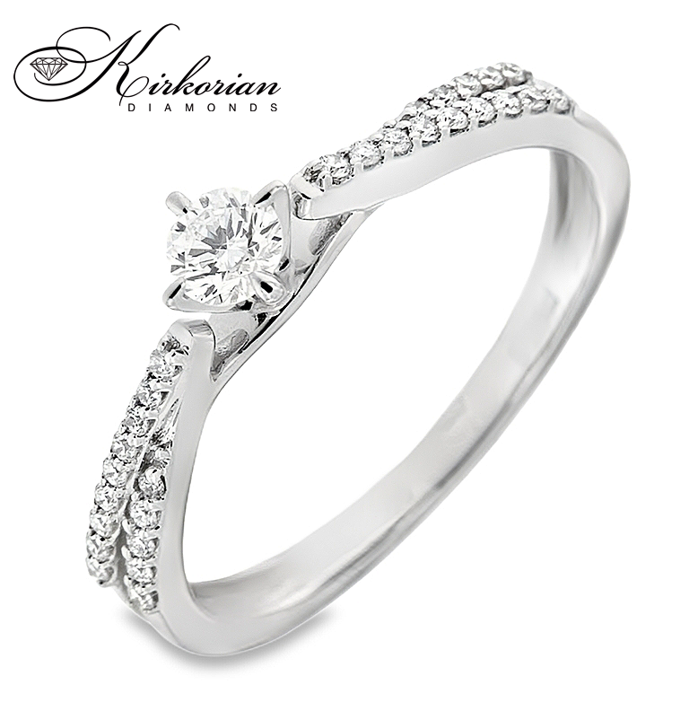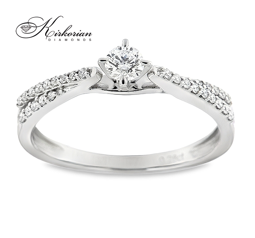 Елегантен годежен пръстен от 14-каратово бяло злато с общо 0.27 карата естествени диаманти, подредени с прецизност в класически кръгъл силует. Централният камък е акцентиран от допълнителни диаманти в горната част на халката, които подсилват блясъка и правят дизайна изключително изискан. Цветът G-H и чистотата SI са идеален избор за отлично съотношение цена-качество. Всички изделия се предлагат с луксозна кутия и сертификат за автентичност от Kirkorian Diamonds