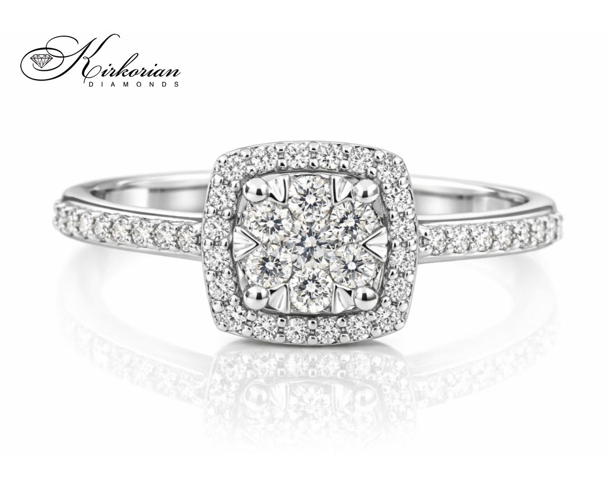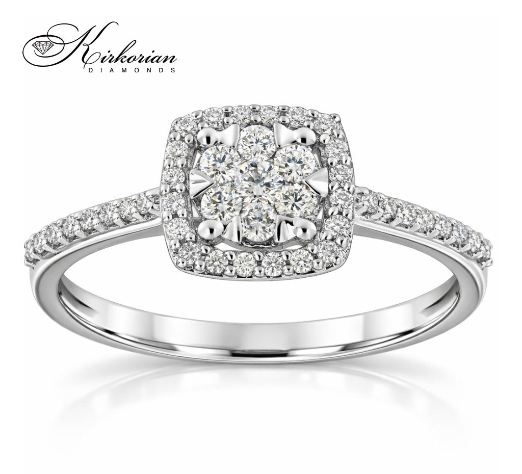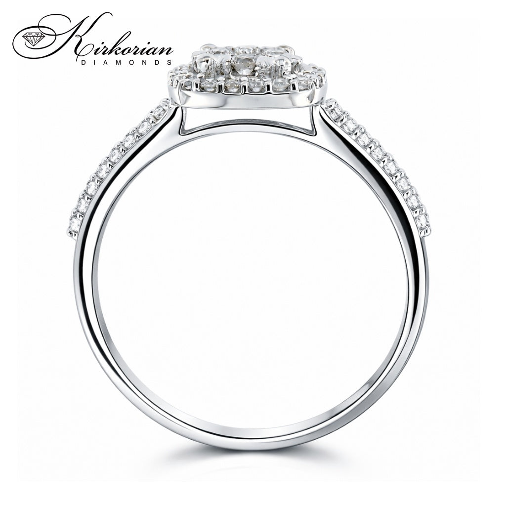 Елегантен годежен пръстен, ръчно изработен от 18-каратово бяло злато с клъстер от естествени диаманти с общо тегло 0.29 карата. Централната композиция е подчертана с брилянтна рамка и инкрустации по халката, които придават усещане за обем и луксозен блясък. Модел RN142 е отличен избор за класически и изискан подарък