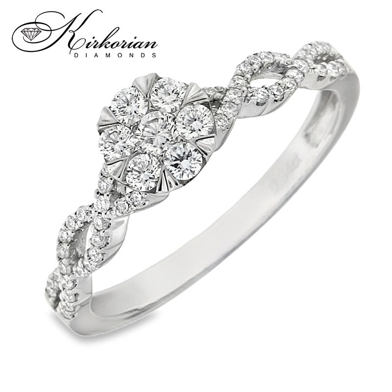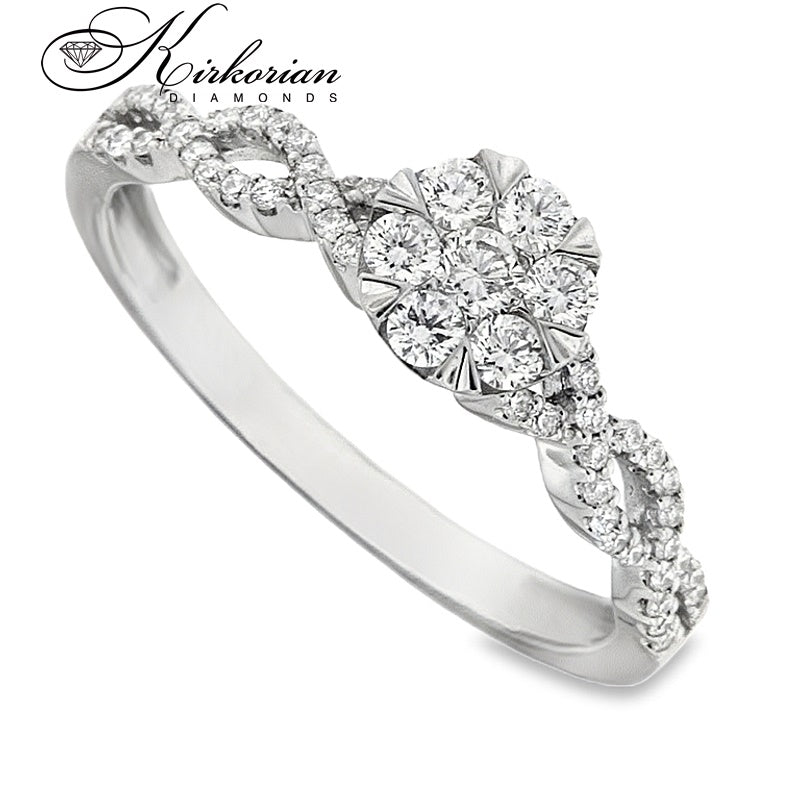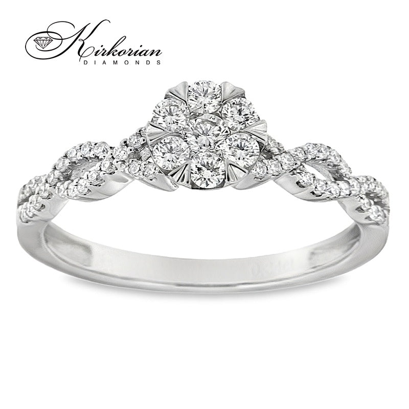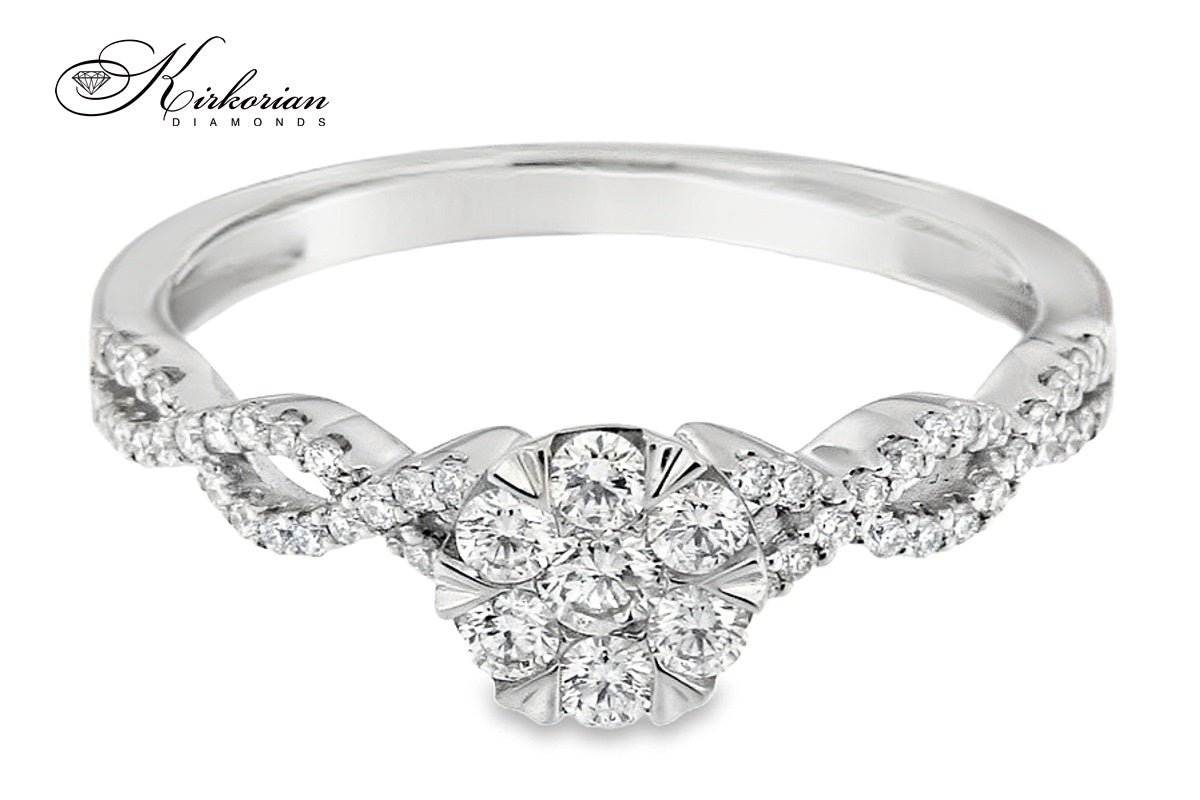 Луксозен годежен пръстен от 18-каратово бяло злато с клъстър дизайн, изграден от естествени кръгли диаманти с общо тегло 0.34 ct. Диамантите са с цвят G-H и чистота SI, разположени в прецизна композиция с преплетена структура на халката, която добавя блясък и обем. Брилянтната шлифовка осигурява силно светлоотражение и изтънчена визия. Всички изделия се предлагат с KD сертификат и в луксозна опаковка