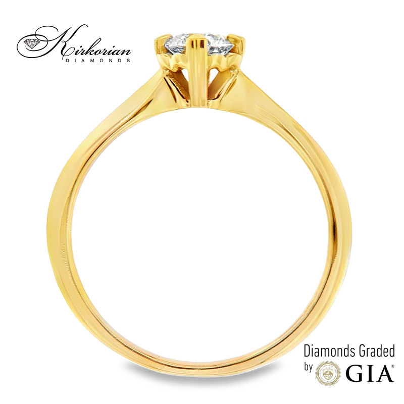 Класически годежен пръстен от 14 карата жълто злато с централен диамант 0.30 карата. Модел K582A е с изчистен силует и стабилна захватка, която подчертава естествения блясък на камъка. Диамантът е сертифициран от GIA и е с отлични характеристики – цвят D и чистота VS2.