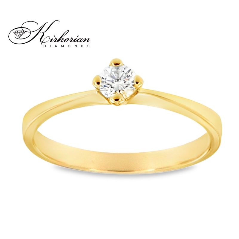 Елегантен годежен пръстен, изработен от бяло или жълто злато 14 карата, с естествен диамант 0.16 ct в класическа шестзъба корона. Чистата линия на халката подчертава блясъка на камъка и придава усещане за лукс и финес. Идеален избор за предложение, което остава завинаги