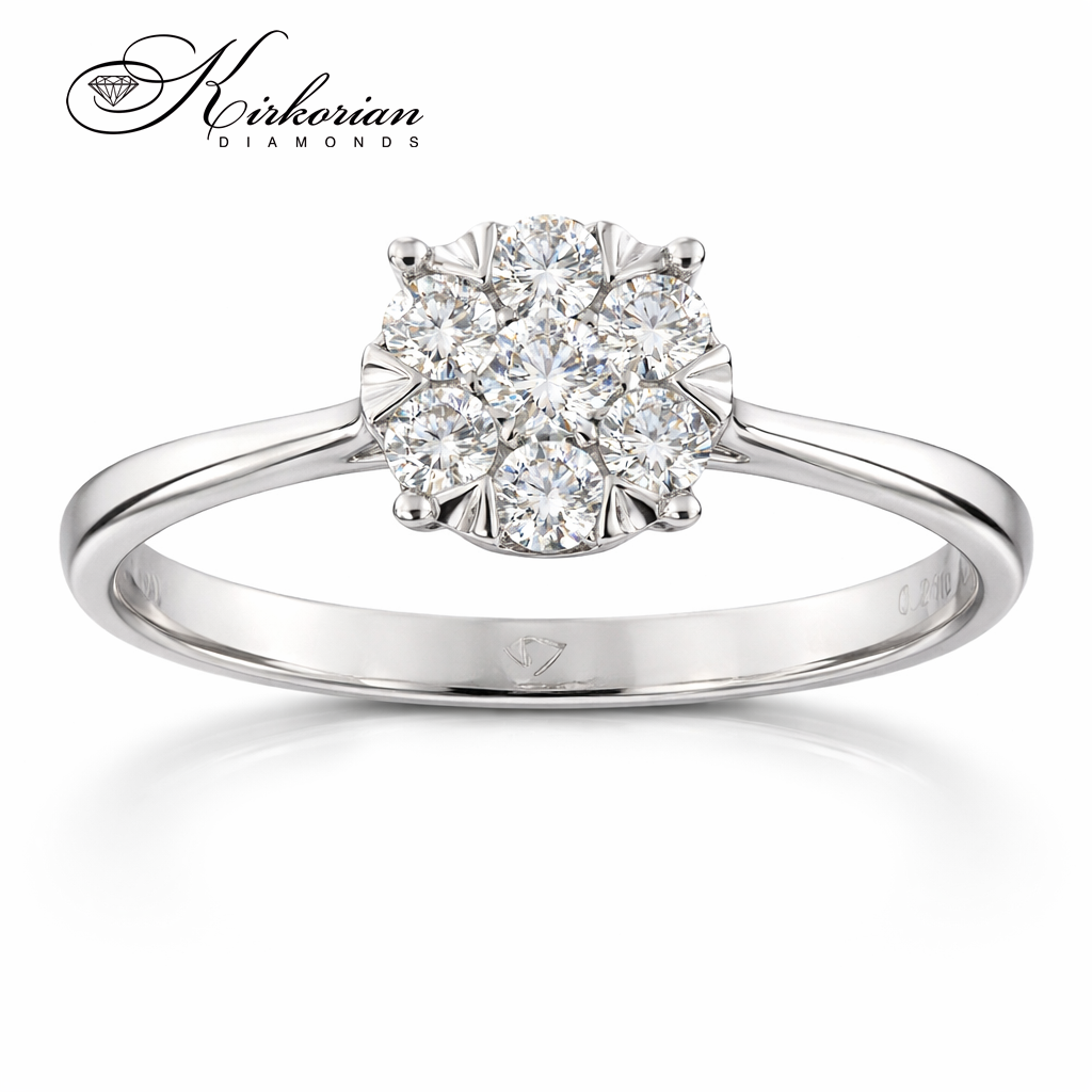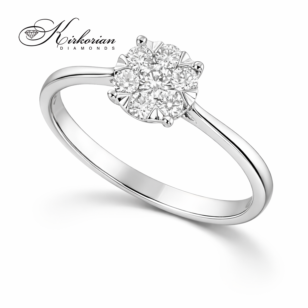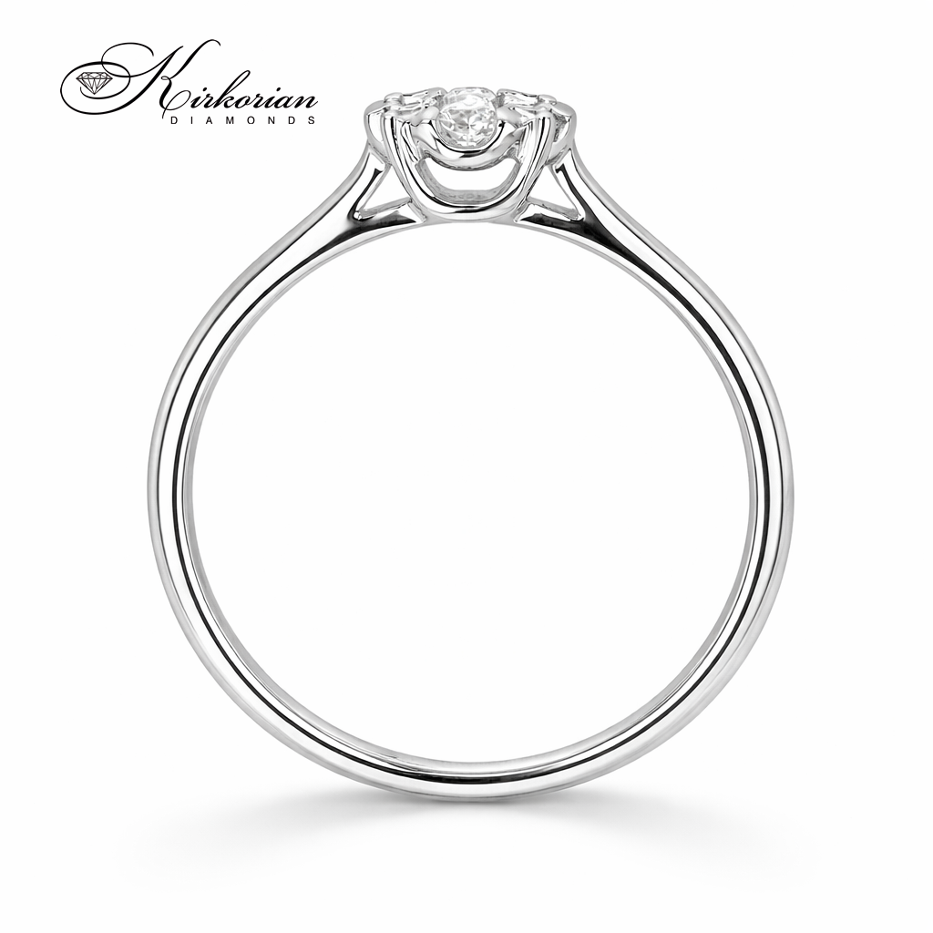 Луксозен годежен пръстен от бяло злато 18 карата с общо 0.25 карата естествени диаманти с брилянтна шлифовка и отлични визуални качества – цвят G-H и чистота SI Пръстенът е с код RN64B и е перфектен избор за стилно предложение за брак или подарък за специален повод Включва KD сертификат за автентичност и се доставя в елегантна луксозна кутия с възможност за корекция на размера