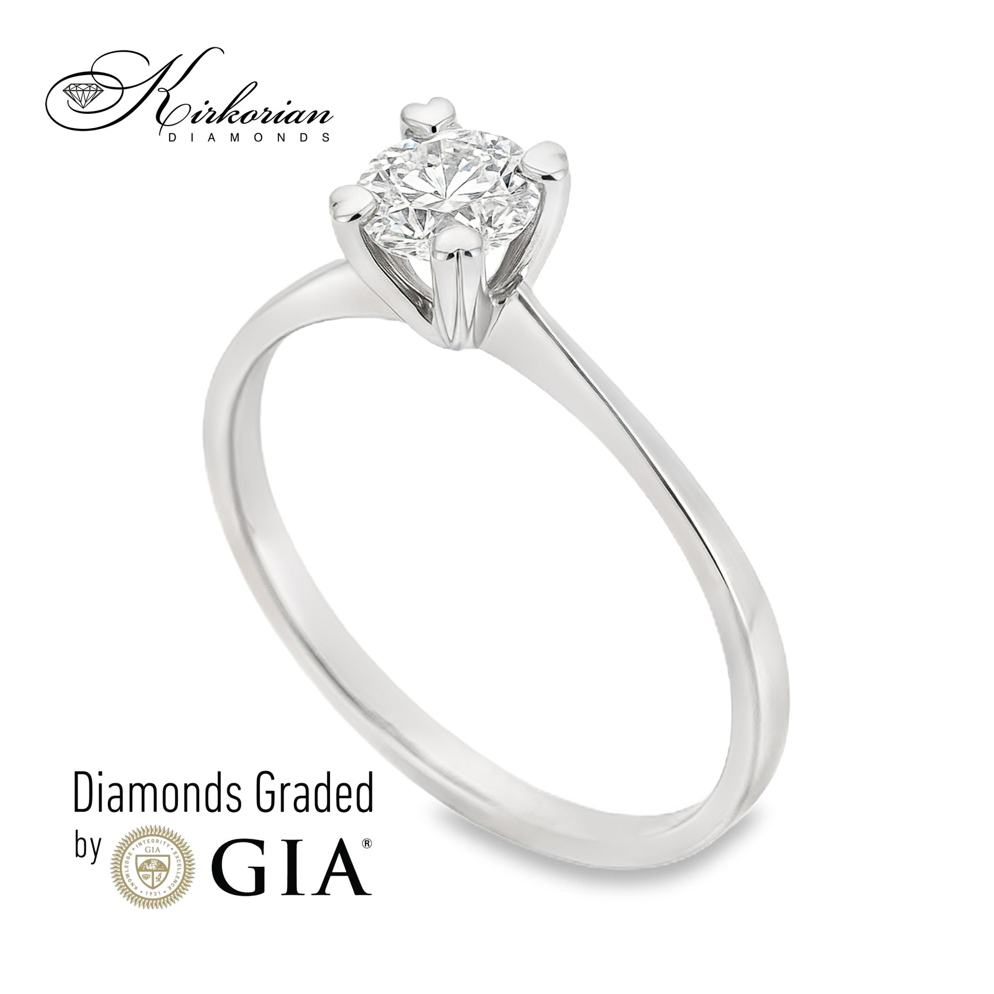 Изключително изискан и елегантен, този годежен пръстен от бяло злато 14 карата впечатлява с перфектна изработка и забележителен естествен диамант с тегло 0.40 карата. Сертифициран от GIA, този диамант е с цвят E и изключителна чистота VVS1, което го нарежда сред най-качествените камъни в света. Прецизната шлифовка тип брилянт разгръща цялата красота на диаманта, придавайки му неустоим блясък и живот.