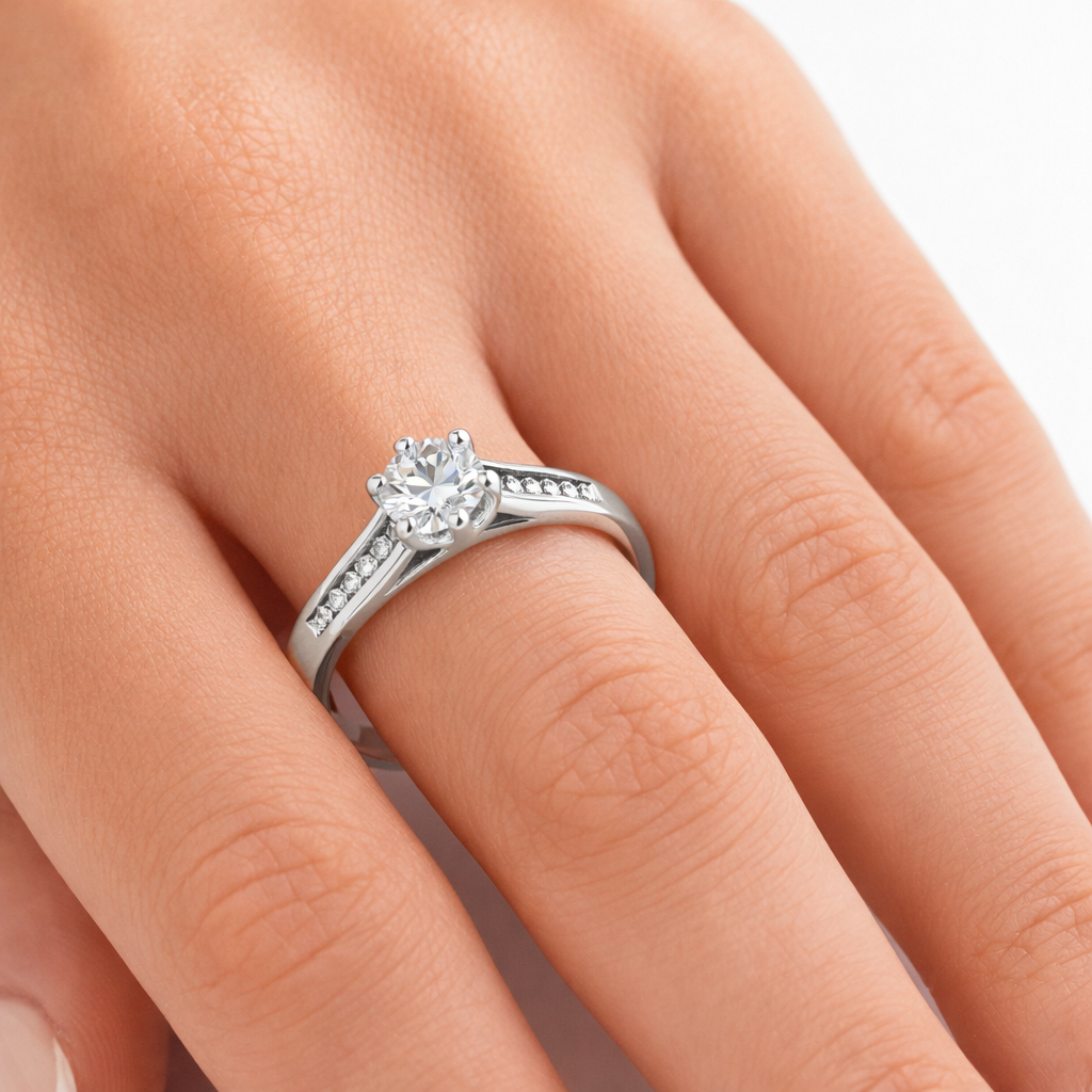 Централният диамант е с тегло 0.25ct, а страничните добавят още 0.10ct за завършен ефект