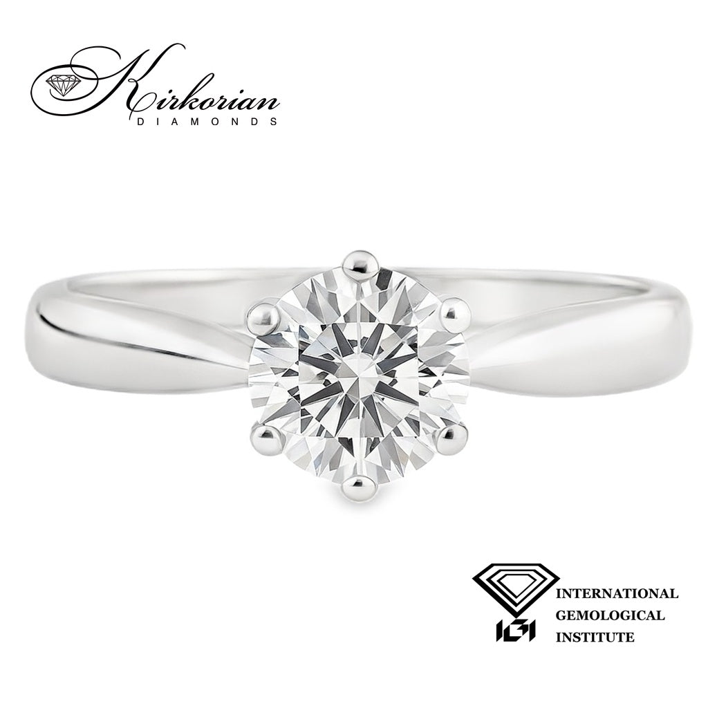 Изчистената елегантност среща инвестиционната стойност в този изключителен годежен пръстен, изработен от бяло злато 14 карата (585) и инкрустиран с естествен диамант 1.00ct, сертифициран от IGI. Дизайнът е класически и вечен, с шест зъбчета, които подчертават идеално блясъка и симетрията на кръглия брилянт.