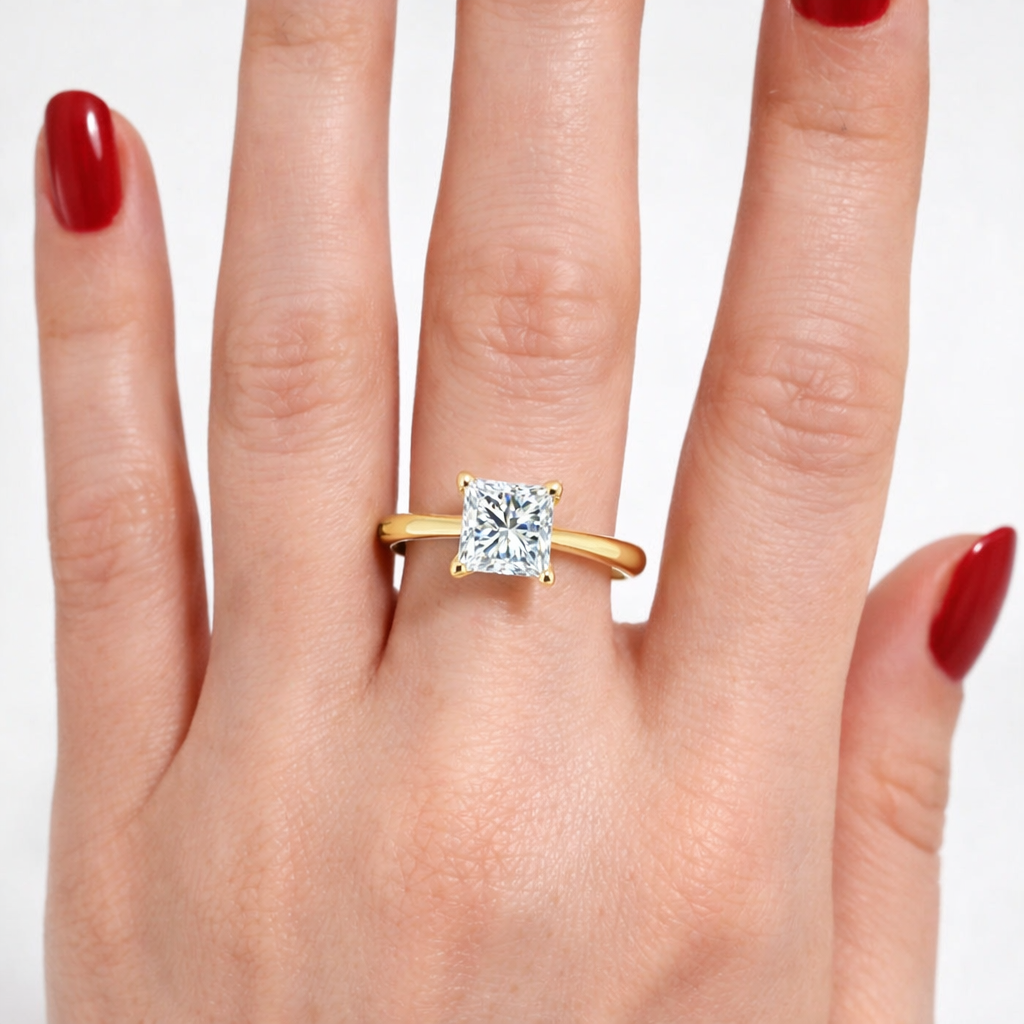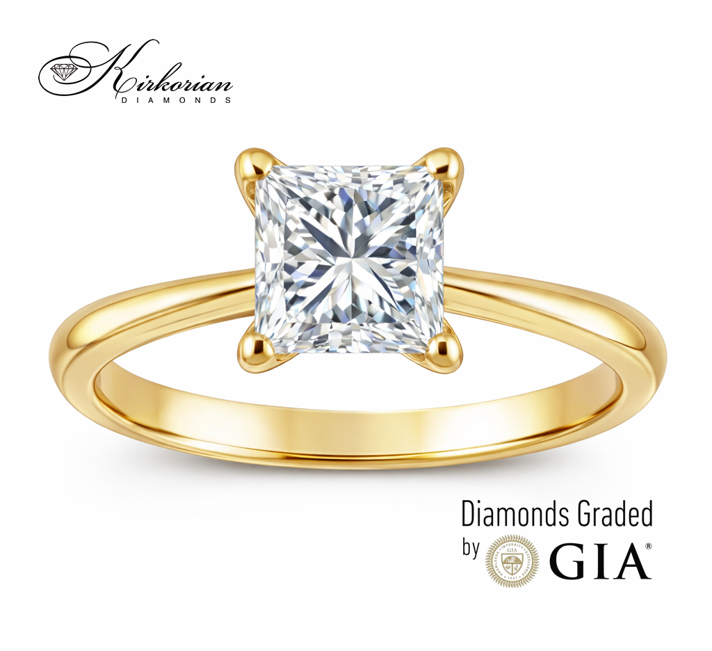 Елегантен годежен пръстен, изработен от 14 карата жълто злато, с инвестиционен диамант с форма принцес и сертификат от GIA Излъчва изтънченост, класа и вечна стойност – перфектен избор за специален момент с гарантирана емоция Диамантът е с тегло 1.00ct, цвят J и яснота VS2, поставен в стилна четирикракова корона, подчертаваща неговата брилянтна шлифовка Този модел е част от лимитирана селекция с висока инвестиционна стойност