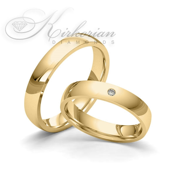 Класически модел венчални халки, изработени от бяло, жълто или розово злато 14 карата, с изчистена и елегантна форма. Женската халка е декорирана с естествен диамант 0.02ct, поставен в центъра за фин блясък и стилен акцент.