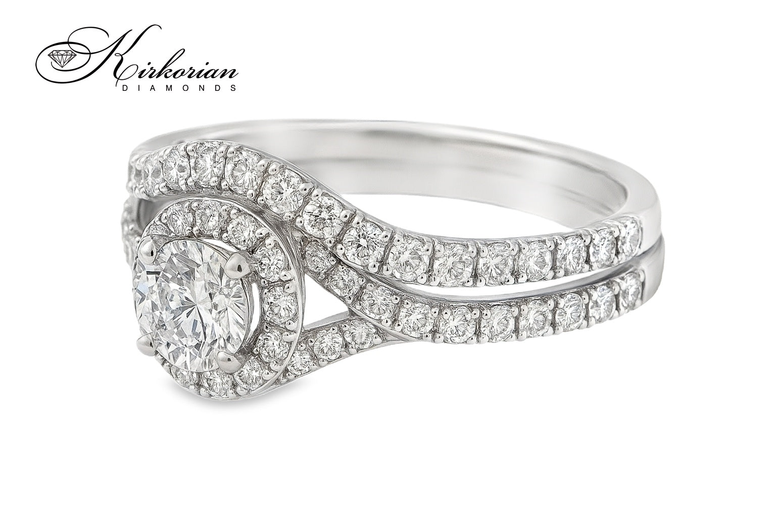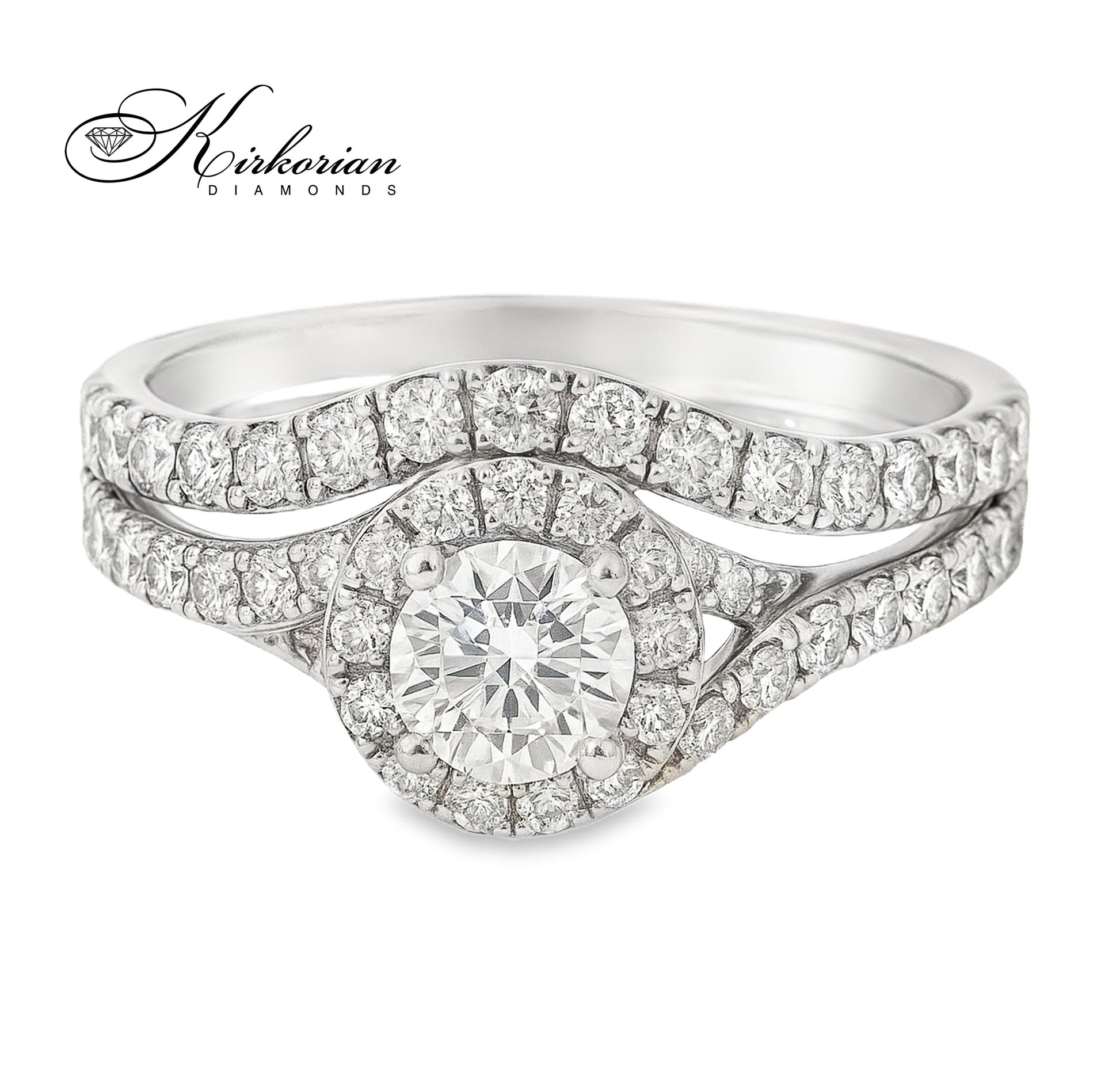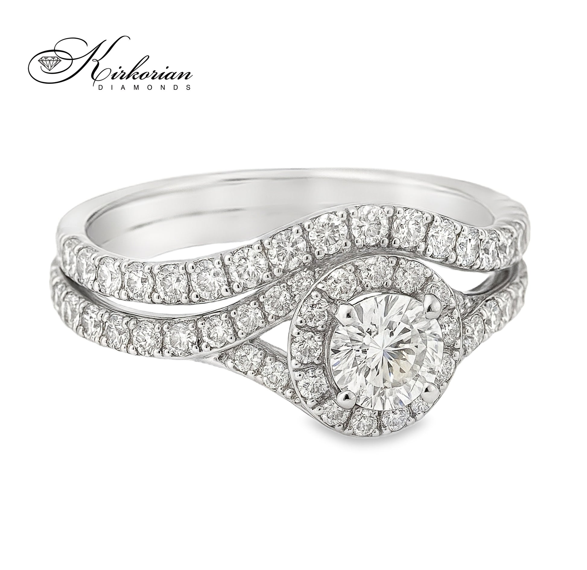 Елегантен и изискан, този луксозен годежен пръстен е изработен от бяло злато 14 карата (585) и е съчетан с допълнителна вълнообразна халка, инкрустирана с диаманти. Централният брилянтно шлифован диамант 0.45ct е обграден от halo диаманти и допълнителни камъни, които продължават по цялата лента, придавайки блясък от всяка страна. Общото тегло на диамантите е впечатляващите 1.34 карата.