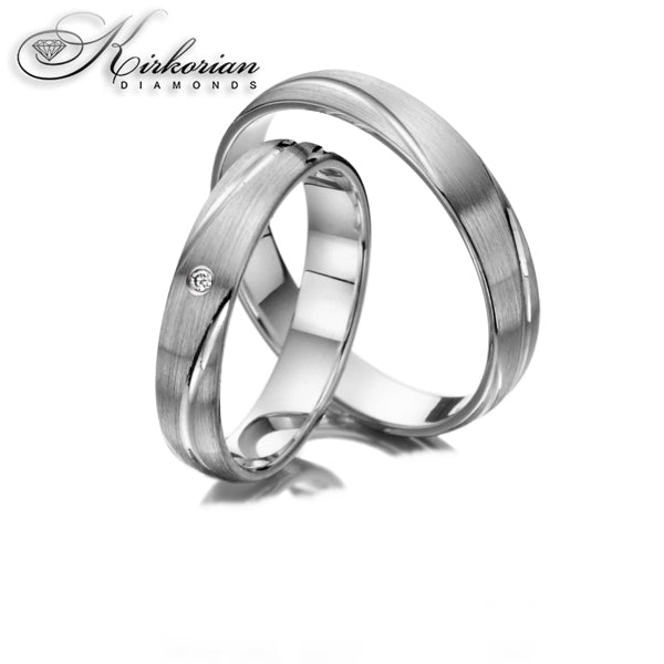 Стилен комплект венчални халки WRD072, изработен от 14 карата бяло злато, с изчистен и модерен дизайн. Халките впечатляват с фина комбинация от матирана и полирана повърхност, а дамският модел е декориран с един естествен диамант 0.015ct, цвят E–F и чистота VS.