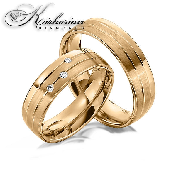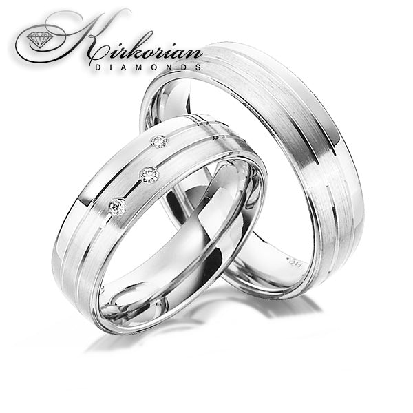 Модерният комплект венчални халки WRD073 е изработен от 14 карата бяло злато с изтънчена комбинация от сатенен мат и полиран гланц. Дамският модел е декориран с три естествени диаманта с общо тегло 0.045ct, разположени асиметрично за елегантен и съвременен акцент.