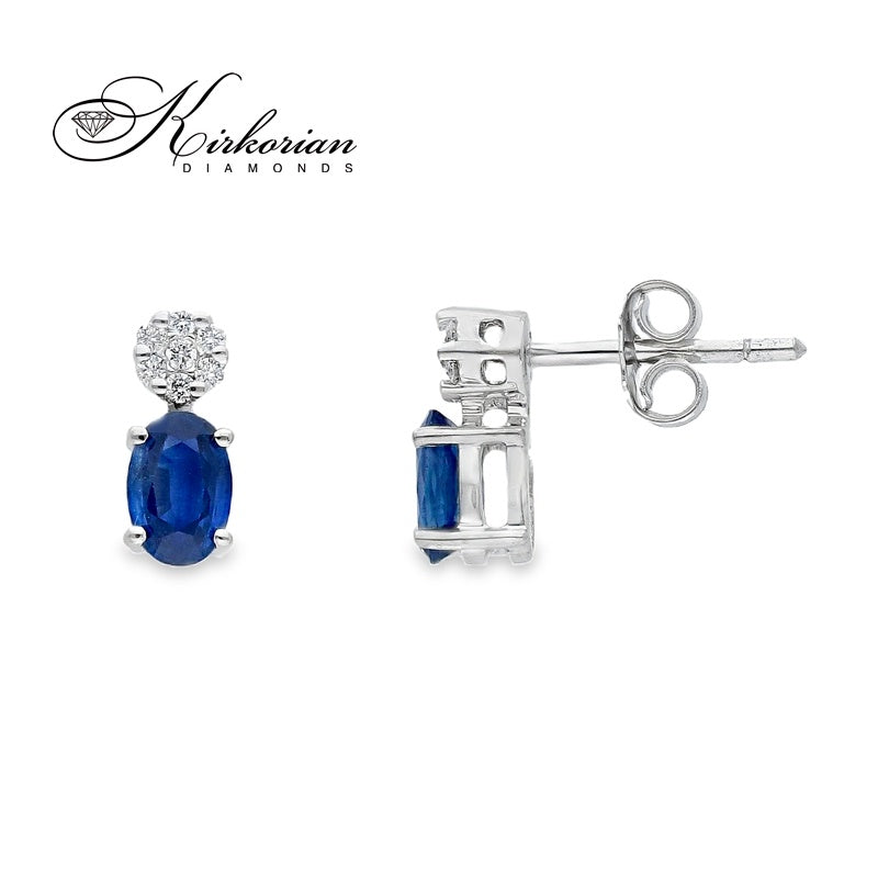 Луксозни висящи обеци от бяло злато 18 карата (750), инкрустирани с естествени овални сапфири 1.00 ct и брилянтно шлифовани диаманти 0.10 ct.