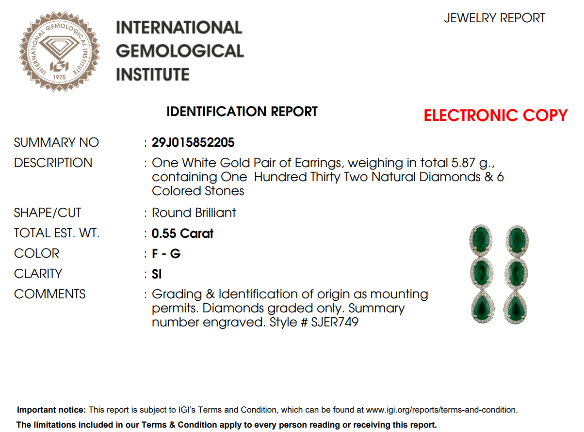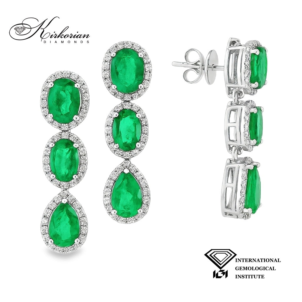 Висящи обеци от бяло злато 18К със смарагди 3.95 ct и диаманти 0.55 ct са прецизно изработено бижу с изразен луксозен характер. Смарагдите са подбрани по наситен цвят и чистота, а обрамчването с естествени диаманти подчертава дълбочината и блясъка на камъните. Сертифицирани от IGI и напълно готови за подарък в луксозна кутия и опаковка.