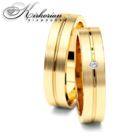 Стилен комплект плоски венчални халки WRD058, изработени от бяло и жълто злато 14 карата (585) с модерна геометрия и комбинация от мат и гланц.