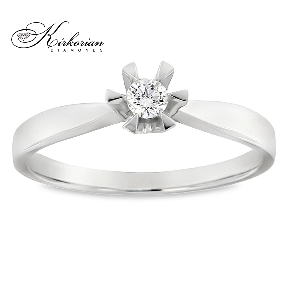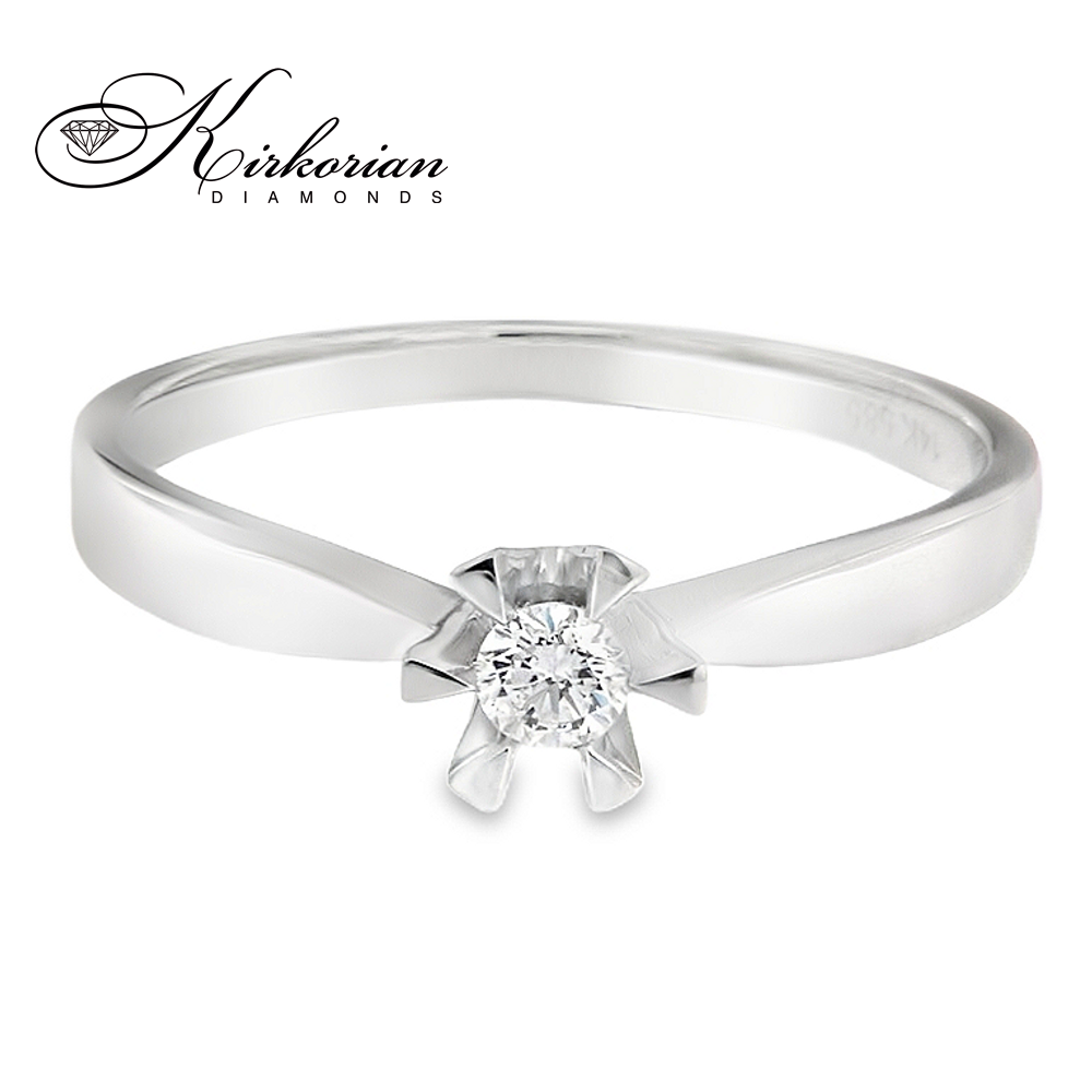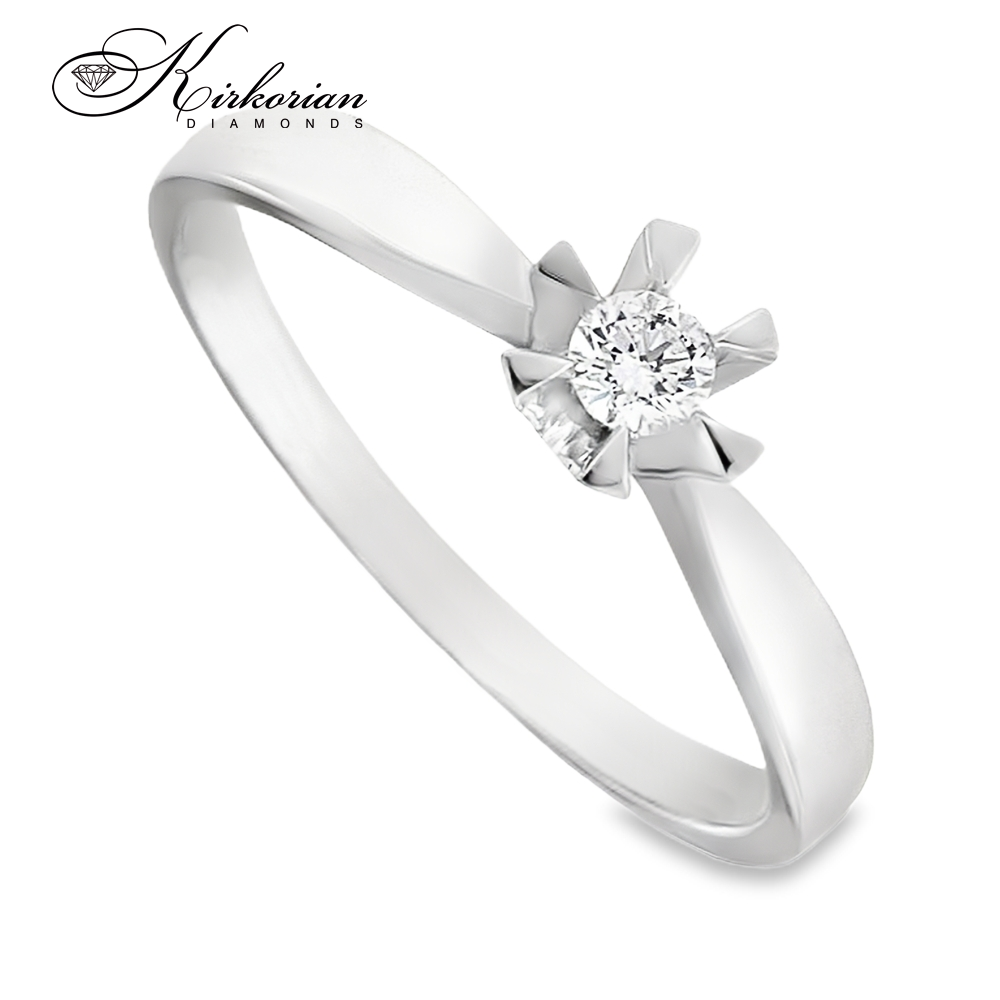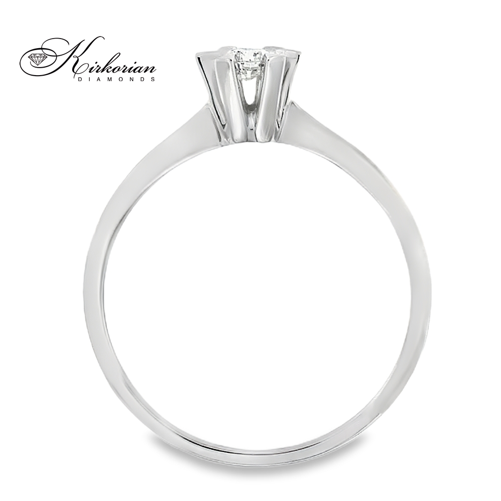 Елегантен годежен пръстен от 14 карата бяло злато с един централен диамант 0.11 ct в стилна солитерна шестзъбна корона. Подходящ за ценители на класическия дизайн и естествената красота на диаманта. Луксозен избор с включена подаръчна кутия и сертификат за качество.