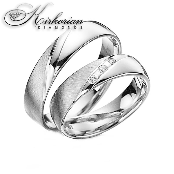 Комплект венчални халки WRD075 впечатлява с модерен дизайн и фина изработка от бяло и жълто злато 14 карата (585). Повърхността комбинира сатенен мат и огледален гланц, създавайки стилен контраст и луксозно усещане. Дамската халка е инкрустирана с три естествени диаманта с общо тегло 0.045ct, цвят E–F, чистота VS – разположени в нежна, елегантна линия.