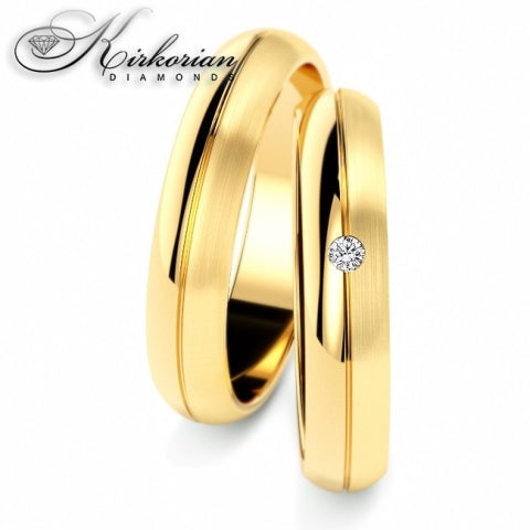 Класически и стилен комплект венчални халки WRD067, изработен от бяло и жълто злато 14 карата (585) с елегантна комбинация от матирано и гланцирано покритие. Дамската халка е украсена с един естествен диамант с тегло 0.015ct, с цвят E–F и чистота VS, който добавя нежен блясък и символика.