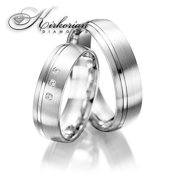 Елегантен и съвременен комплект венчални халки от бяло злато 14 карата (585), отличаващ се с комбинирана матова и полирана (гланц) повърхност. Този контраст придава модерен характер и изискан завършек. Дамската халка е украсена с три естествени диаманта с общо тегло 0.045ct, подредени вертикално в изчистен стил.