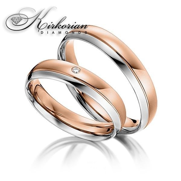 Елегантни венчални халки, изработени от розово и бяло злато 14 карата, с модерен и изчистен дизайн, който съчетава стил и символика. Женската халка е акцентирана с естествен диамант 0.015ct, инкрустиран деликатно в центъра, което я прави изтънчена и запомняща се.